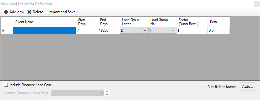 Each load event can be labelled using the Event Name input line. The time period associated with the loading event is input with a start and end time, input in days. The load group which represents the loading event is then selected and the appropriate quasi-permanent load factor input along with the relevant beta factor. Additional loading events are added by selecting