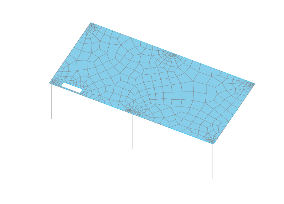 When FE surfaces are representing large structural elements, for example large area floor slabs, particularly when the FE surface has a large number of constraints from other structural elements or geometry, the issues encountered in meshing can be due to the difficulty of forming a mesh in the large FE surface itself. This is more likely when the FE surface has edges that are not parallel or has a lot of internal constraints which are not parallel to the boundary, requiring the mesh to align in different orientations at different constraints.