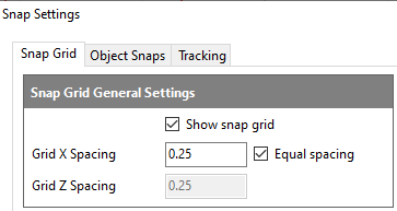 The grid can be seen (grey lines) in the background of the model. The spacing of the grid in this example has been set to 0.25m but when the model is small on screen, the grey line spacing is 6.25m so as to avoid the grid being too cluttered. However, the points in the grid can still be picked off at the 0.25m set spacing.