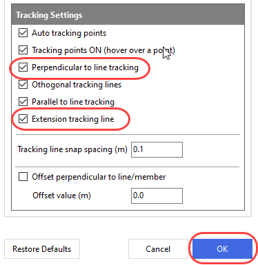 The nature of a tracking line provided at a tracking point can be controlled using the tracking settings. Here we can see we get tracking points as a ‘project from’, ‘orthogonal from’ and also ‘perpendicular to’.