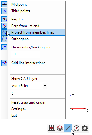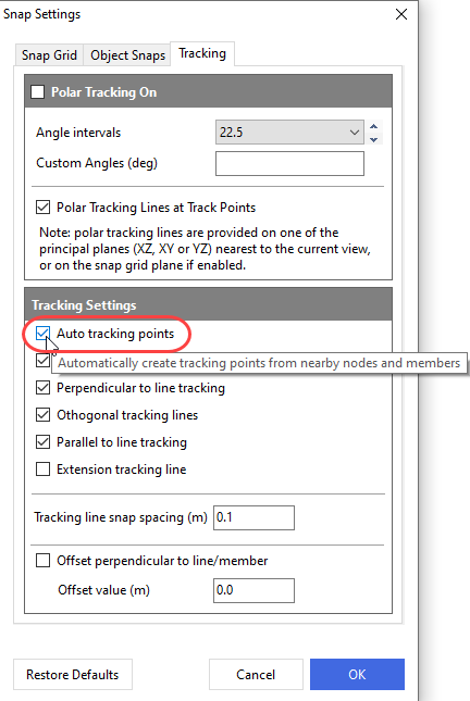 When generating the second end of a new member we will get automatic tracking points away from the existing members. This again can lead to a multitude of tracking points in 3D space which can sometimes be undesirable as it can create a very busy set of tracking points in a small space. This is called auto-tracking. Auto-tracking can be turned off, meaning that those points aren’t given by automatic default.