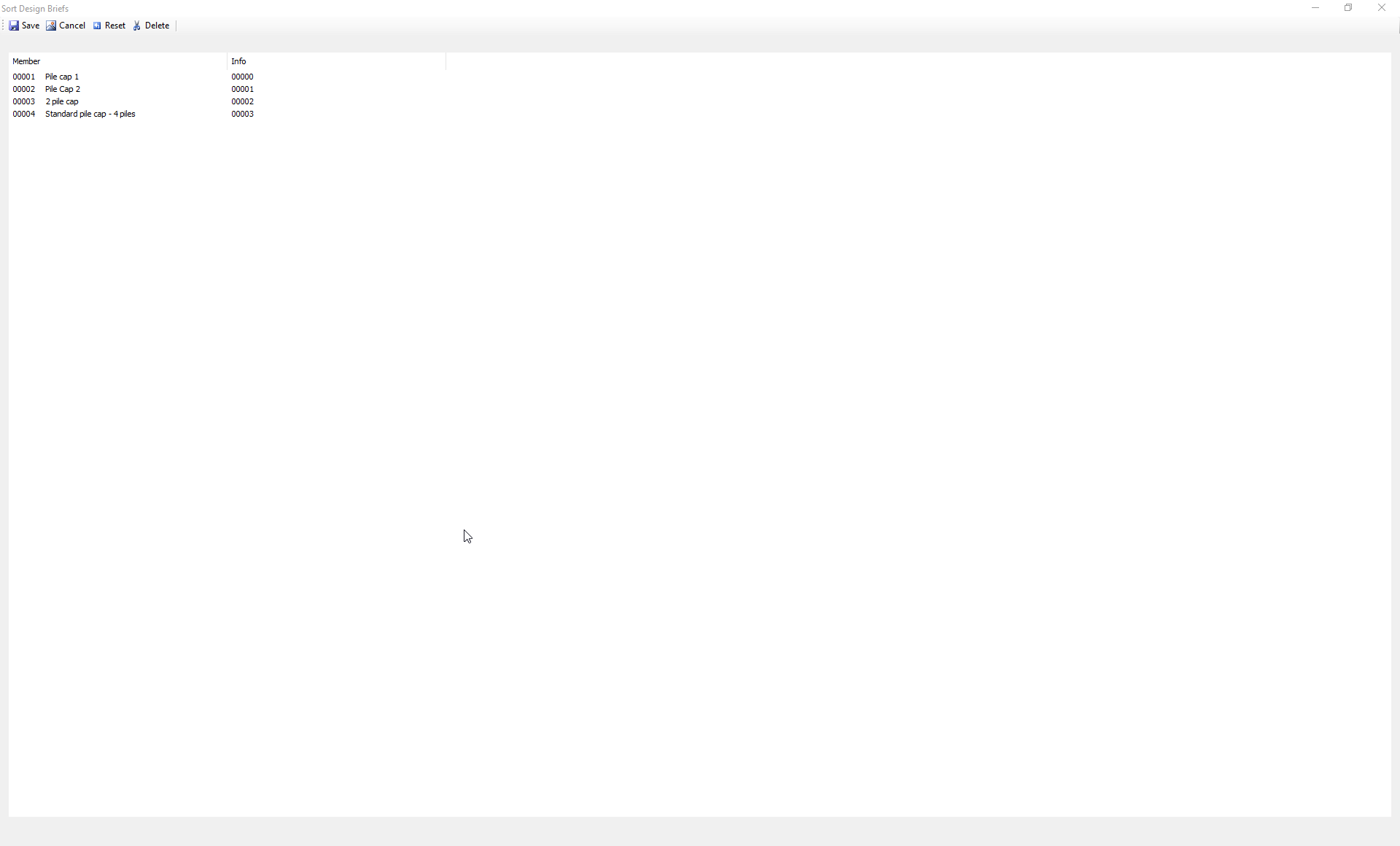 Selecting the sort icon  brings up a list of all the design briefs in the current file. The screen layout changes from the pile cap interface. A typical layout is shown below: