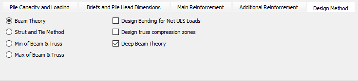 The design method tab provides options to set or control the design for the pile cap. The details of the design method employed are given in the Pile Cap design section above.