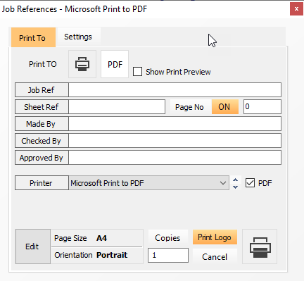 The print menu allows the design outputs to be printed to either a printer or as a pdf. There is also an option to define the Job and Project references, which is also included in the Edit menu.