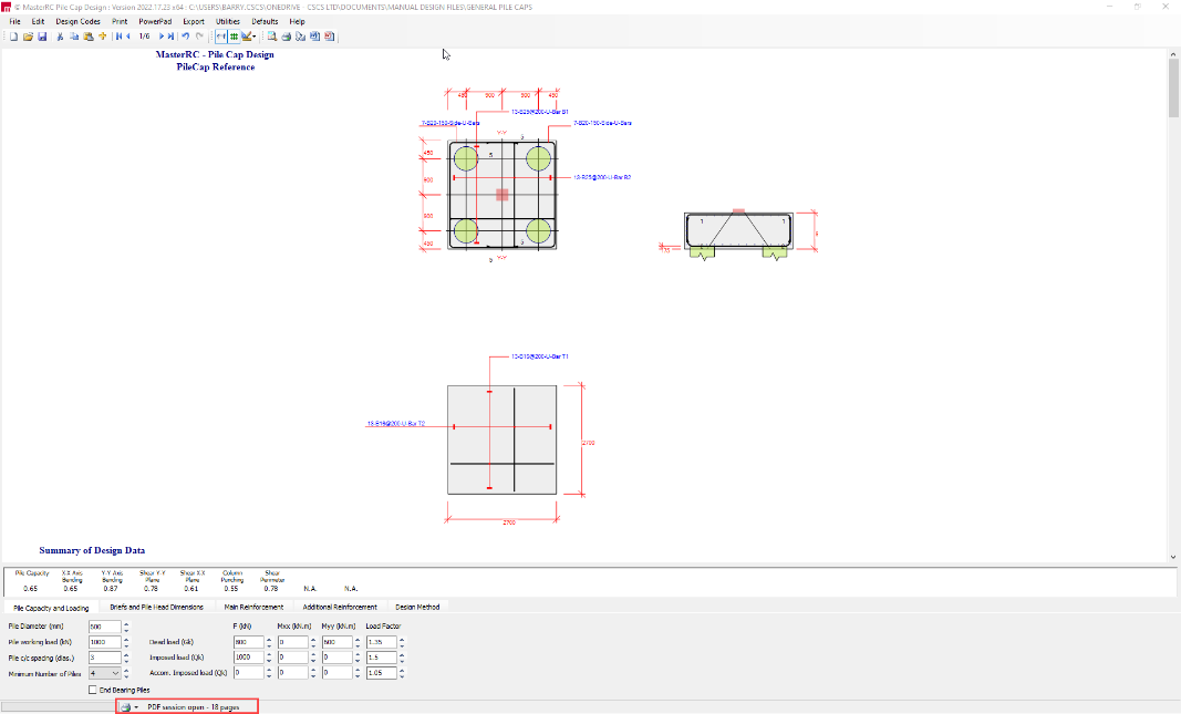 An open pdf session allows other design outputs to be added to a pdf file, for example when compiling design calculations for a project. To create the pdf file, expand the drop down to give the following submenu –