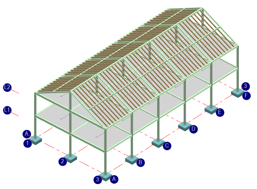 In MasterFrame create a 2D or 3D model. This model can be of mixed materials, for example, a steel framed building on concrete foundations with a timber roof.