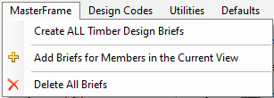 The MasterFrame Menu allows you to Create ALL Timber Design Briefs for the whole frame or to add briefs to only the members in the current graphics view. Alternatively, you can delete all the existing design briefs should you wish to subsequently recreate them all.