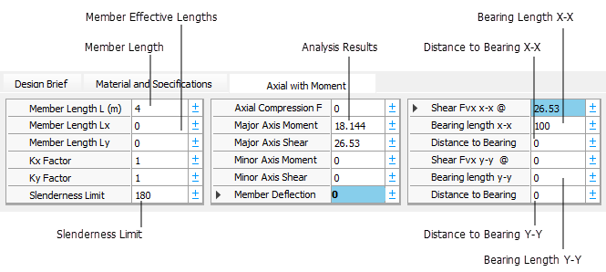 The Bearing Lengths and Distance to Bearings for both axes can be altered in the Axialwith Moments tab. All other forces, moments, shears and member lengths are carriedover from the analysis, therefore the user cannot change these values in the design partof the program.