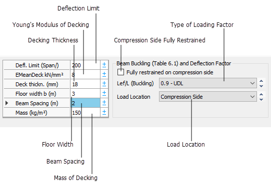 For beams with a timber flooring on top, a vibration check can be carried out by entering the Young's Modulus, and the thickness and mass of the decking along with the floor width and beam spacing.