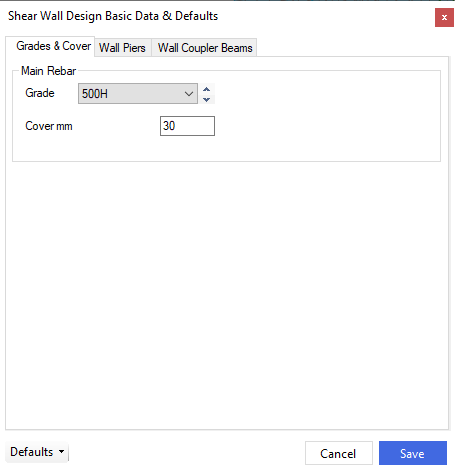 The Defaults menu allows for the setting of parameters that will apply globally to the design of wall piers and coupler beams within a project. As well as setting the grades of both the concrete and reinforcement for the wall designs, the default and allowable reinforcement sizes and spacings can be set for both the wall pier and coupler beams designs. For the wall piers, the default design method for pier subdivision can also be set as a global parameter.