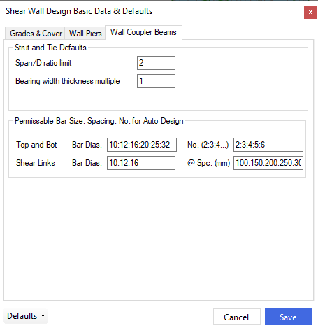The wall coupler beams default area is shown below. The inputs here define the default reinforcement bar diameters and bar numbers/spacings. The Span/Depth limit gives control over when the software defines a beam to be ‘deep’ and so controls when the software will attempt to use the
