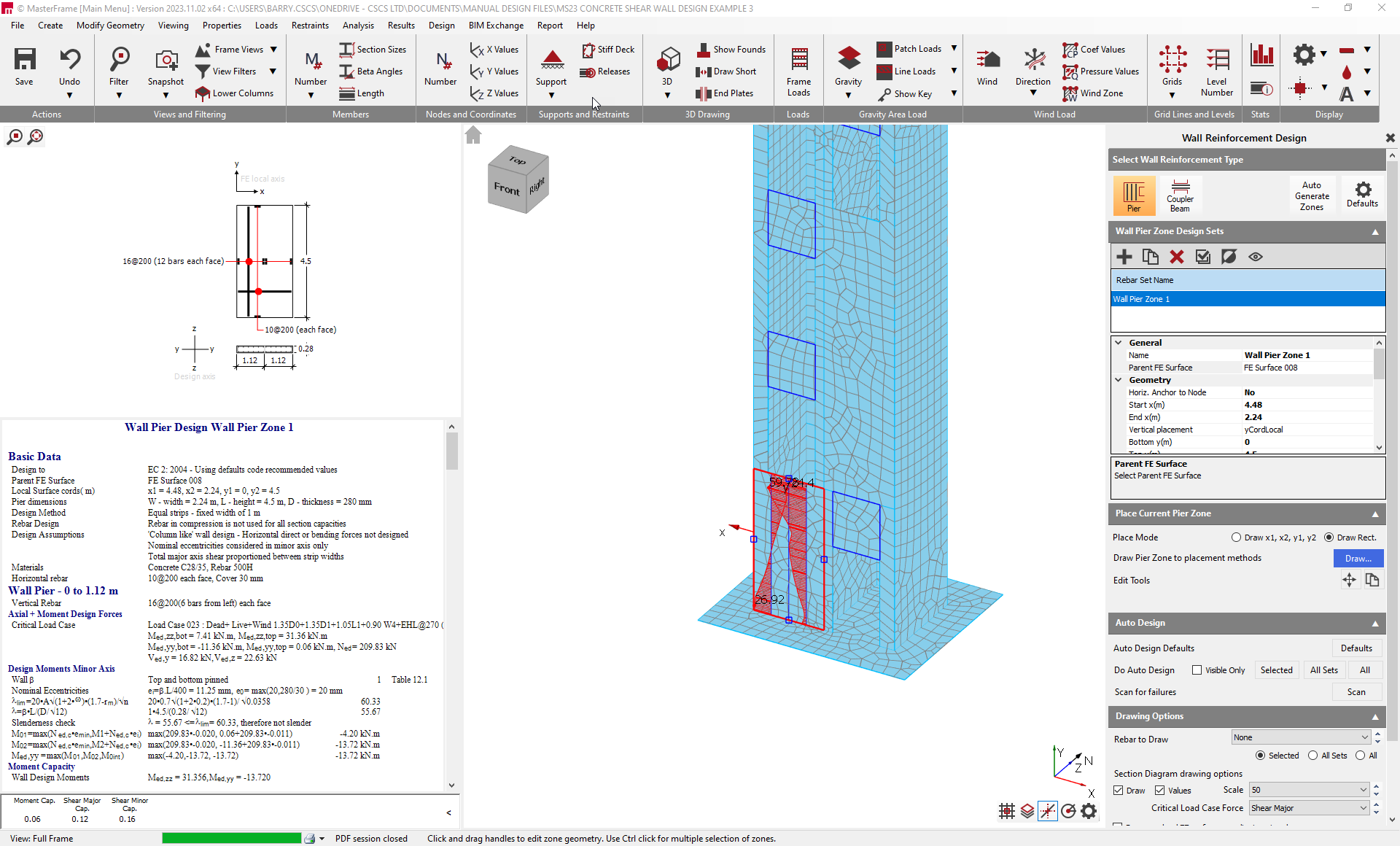 icon. A Wall Pier Zone item will appear in the Rebar Set Name area and some initial Basic Data will appear listed in the design calculations area. The next stage is to highlight the FE surface that the new pier zone will be associated (or partly associated with if the pier is to extend beyond this) by placing the cursor near the boundary of the FE surface in the graphics window. The FE surface is selected by clicking with the left mouse button. Next, the pier needs to be created using the Place Mode options which control how the pier is created. With the desired placement mode set, click on the