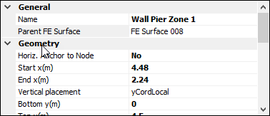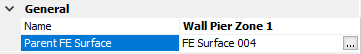 The Parent FE surface notes the FE surface the wall pier is associated with. A wall pier can be associated with any of the FE surfaces within the plane of the wall. That means that the wall pier need not be defined to lie wholly or partly within the parent FE surface, though in must lie within the same plane set of FE surfaces as the set parent FE surface. The setting out coordinates of the FE surface are defined relative to the selected parent FE surface – see the Geometry input area.