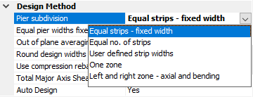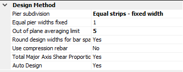 The Design Method area provides inputs to control the design of the wall pier. These options include the ability to specify the subdivisions of the pier over its width, the limit on the averaging of the forces within each sub-pier, an option to control whether or not the vertical reinforcement is used in the compression zone and how the major axis shear is apportioned across the pier subdivisions. There is also an option to control whether the Auto Design will include the wall pier.