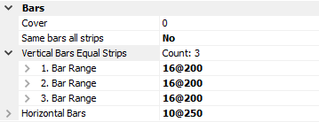 If the ‘Same bars all strips’ option is set to ‘Off’ the vertical bars line will change to display the number of all sub piers, and on expanding this area, each subpier can then be selected and the vertical reinforcement defined, as shown in the following example
