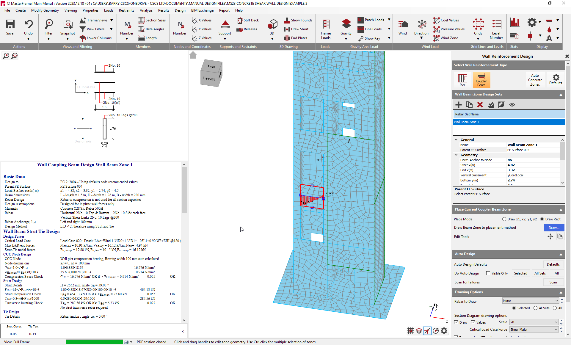 icon, and draw the required extent of the wall beam. Once done, the calculations area will populate with the design calculations and the wall beam setup will show in the coupler beam properties panel. The layout of the screen is shown below.