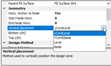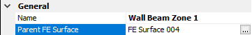 The Parent FE surface notes the FE surface the wall beam zone is associated with. A wall beam can be associated with any of the FE surfaces within the plane of the wall. That means that the wall beam need not be defined to lie wholly or partly within the parent FE surface, though in must lie within the same plane set of FE surfaces as the defined parent FE surface. The setting out coordinates of the FE surface are defined relative to the selected parent FE surface – see the Geometry input area.