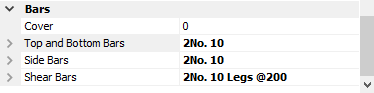 Each of the input areas can be expanded by clicking on the left-hand arrow. The expanded area contains additional inputs to define the diameter of the reinforcing bars, and an input to define either the number of the bars (top, bottom, and side bars) or the bar spacing (shear bars).