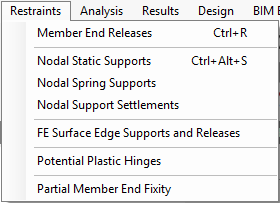 The Restraints menu gives you access to member end releases, allowing the ends to be pinned or rigidly connected to adjacent members. You can also specify member end external support conditions, as nodal static supports, spring supports and support settlements. Other features relate to FE surface edge supports, plastic hinges and partial member end fixity.