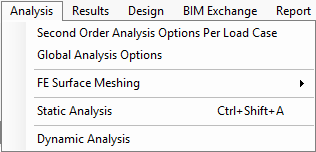 The Analysis menu allows you to carry out Second Order Analysis, choose between various Global Analysis options and initiate the Static Analysis of the model. FE Surface meshing details can be varied before analysis is carried out.