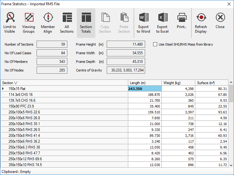 The Frame Statistics table gives a considerable amount of information on the quantities of materials within the frame. Principally the section sizes are listed along with their lengths, weights and surface areas with the totals at the bottom of the table.