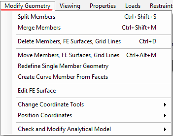 From the top menu bar, the Modify Geometry menu contains a range of functions to allow you to quickly and easily modify the geometry of your structure.
