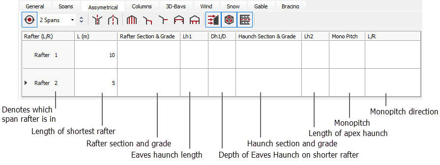 In an asymmetrical frame (obtained by keeping the Apply Global Symmetry and Apply In-Bay Symmetry buttons disabled), you specify the default information in the Spans tab for the left hand rafter. Details for the right hand rafter are entered in the Asymmetrical tab as indicated below. In the row representing the appropriate rafter number, enter the rafter’s horizontal length, section size and haunch details if required. You can also swap the left and right hand rafters about using the L/R (left or right) option.