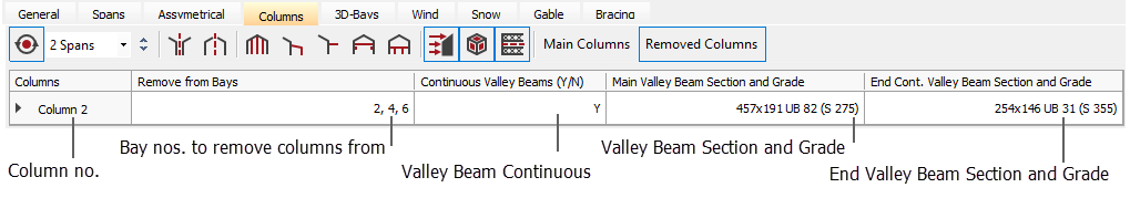 There is also the option to have a hit and miss columns set up in a multi-span portal, at the valley. First select the 'Removed Columns' button to change the tab as shown below. Enter the column no. on which the hit and miss columns are to run. Then add the bays in which the columns are to be removed. Valley beams will now be added along where the intermediate columns have been removed. These can be set as continuous or simply supported and a section size specified. Often the end bays section size can differ from the main valley section size and this can be specified also.