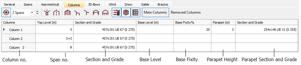 The portal column top and bottom levels, section size, grade and base fixity can be specified in the Columns tab. External and internal parapets can be added by specifying their height and section size.