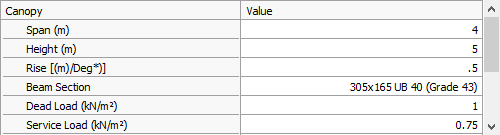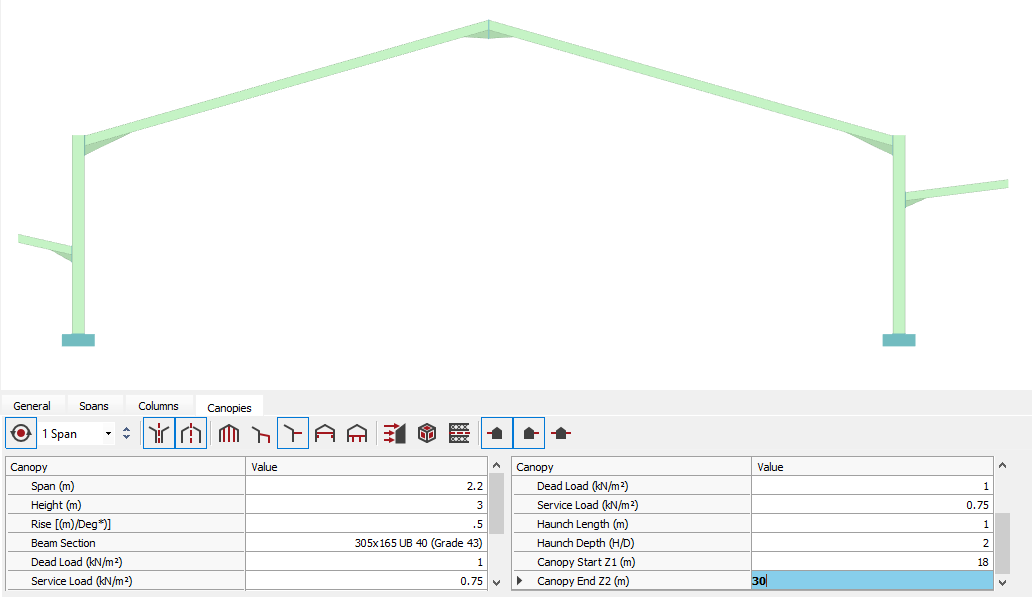 Side canopies are easily added, again by specifying the geometry, section size, loading, haunch geometry and the start and end distances along the side of the structure, eg:- 18m to 30m would give a canopy starting at 18m along the side of the frames, (from the front gable end) to 30m.