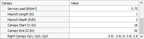 You can define canopies for both sides of the structure or one side only. You can have both sides identical to one another, or define them separately. Note that the Global Symmetry and In-Bay Symmetry are overridden by the symmetry buttons in the Canopy tab.