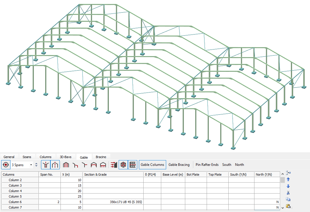 You can omit a set of gable columns from the North or South ends using the last two data entry columns. Note that in the diagram below, the columns have been omitted from the north end in span two by typing “n” in the appropriate cell.