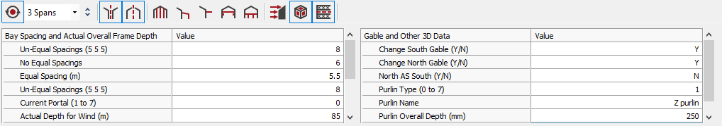 The main frame at each gable defaults to the same section sizes as the portal frames. To change the gable frame rafters and columns from these defaults, alter the values in the 'Change South Gable' and 'Change North Gable' to 'Y'. You can opt to have the South and North gables with the same section sizes - enter 'Y' in the 'North as South' data cell. Entering 'N' means the gables can be different.