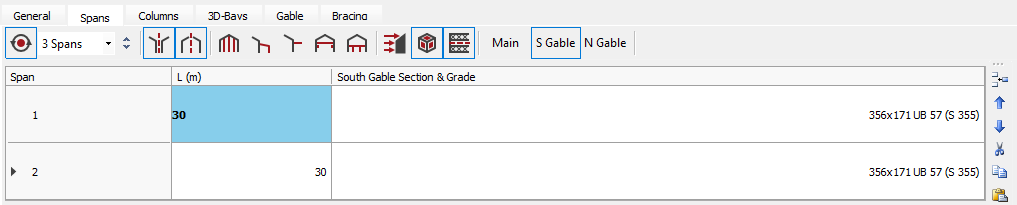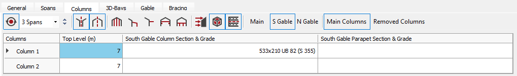Now move to the Columns tab to change the gable main columns section. Select the S Gable button to move to the south gable, altering the section sizes in the different spans. Do the same for the north gable.
