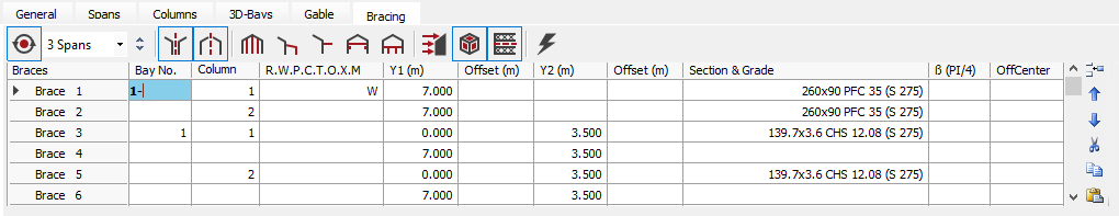 The fourth column (Y1) is the start position of the tie or bracing member, whereas the sixth column (Y2) is the end position. For wall bracing and some of the ties, these values are in the vertical (y-axis) plane, and for roof bracing and most other ties the values will be in the horizontal (x-axis) plane. Note that it is not necessary to give full x and y coordinates, but just the positions along the member. Also note that the first x or y entry will be on the southernmost frame.