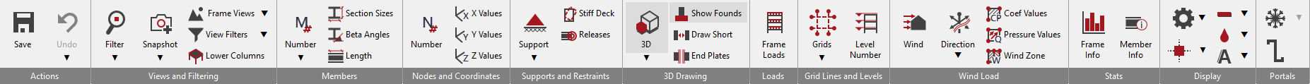The top toolbar in MasterFrame gives you access to numerous tools that you will find beneficial when examining and navigating through your model. This toolbar is dynamic in that it compresses and expands depending on the size of your computer screen. As it compresses the icons become smaller and their individual descriptions are no longer visible. A minimum screen width of 960 pixels is required to display the compressed toolbar, although a preferred width of 1280 is recommended to show the intermediate toolbar and 1768 for the full toolbar. The tools are grouped into appropriate sub-sections with each sub-section including a set of related options.