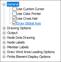 The settings option opens up a list of items that can be set as on/off for display on the frame. These include drawing options, node and member labels, wind area loading colours and finite element display options. Each list can be opened by clicking on the + sign. Tick the box for any item you want to include on the frame.