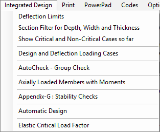 If you have switched off the Simplified Interface in the editing end of the program prior to going into the design end, then the Integrated Design menu will also appear in the main menus at the top of the screen. These options will allow you to add design briefs to members of the frame since the automatic application of briefs when the simplified interface is on, is no longer available with it off.