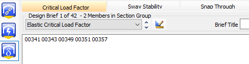 The Elastic Critical Load Factor check can be used in the portal frame checking process. It is unlikely that a portal frame will fall beneath the critical factor of 10 and so the check is usually not going to be an issue. Occasionally some of the non-portal minor members could give a factor under 10 and so should be checked. It is possible to omit some members from the check, eg, parapet members or canopies that are not going to influence the overall stability of the building. To omit members set the cursor into the large box at the bottom of the screen, then click on the individual members that you wish to omit. These particular members will be removed from the check. (The numbers of the omitted members appear in the box.)