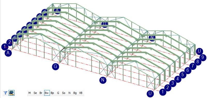 Additional design groups are included in the list of groups. As well as the main portal frames (M), groups have been automatically set up for the other various members of a 3D portal structure. Each of these groups will have design briefs applied to the groups of members. By selecting the relevant group letters at the bottom of the graphics area the associated design briefs will be selected.